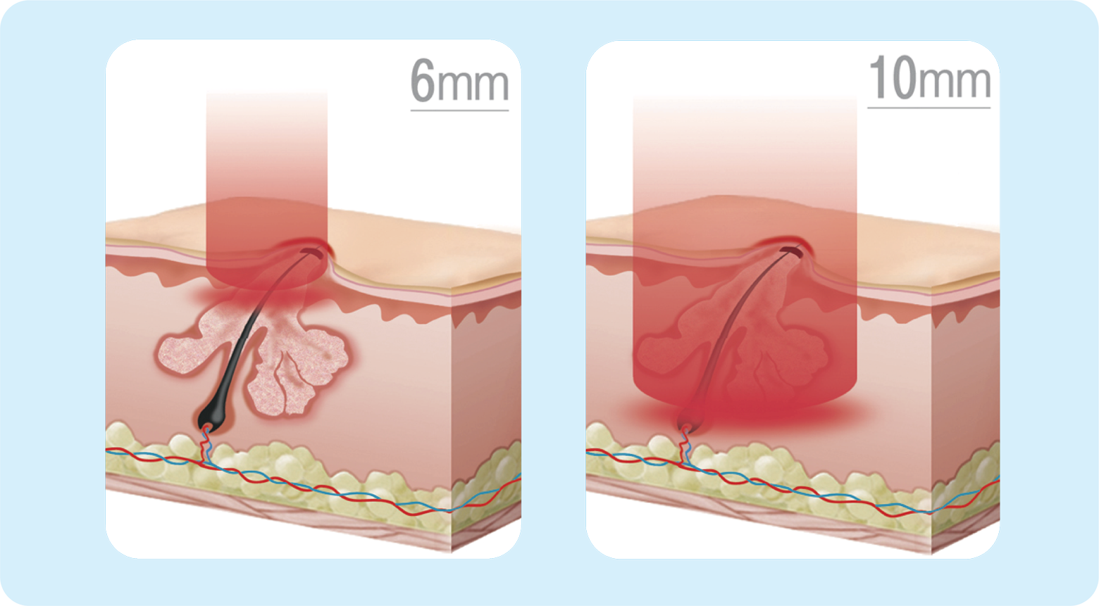 擁有6mm與獨家10mm大光點 治療面積更大·熱能穿透更深 更有效穿透至皮脂腺·減少油脂過度分泌