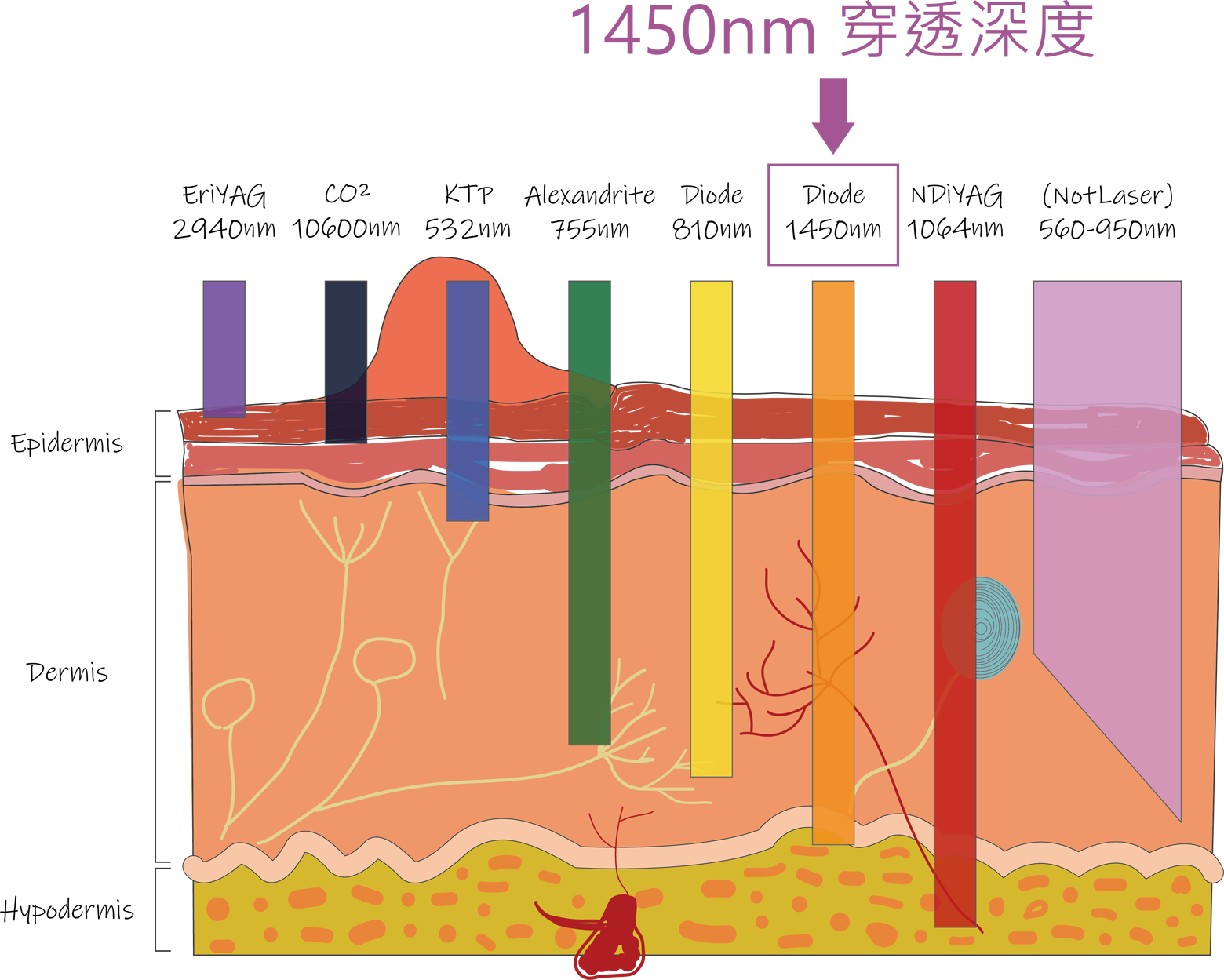 1450nm的波長皮下穿透深度深 可以深入皮膚到皮脂腺的位置(平均深度0.5mm) 降低油脂分泌,減少痘痘生成